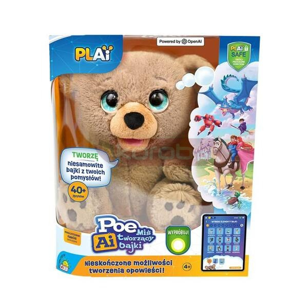Miś POE - Twój Prywatny Kreator Bajek z AI! Oprogramowanie sztucznej inteligencji pojawia się wszędzie - a teraz jest nawet w misiach! Dzięki Misiowi POE każda opowieść, jaką usłyszy Twoje dziecko, będzie wyjątkowa i dostosowana do jego gustu. Ty wybierasz, Miś POE tworzy! Chcesz, aby Twoje dziecko słuchało opowieści, które samo współtworzy? Wybierz bohaterów, miejsce akcji, a nawet nastrój - śmieszna czy straszna historia? A może zostawisz wszystko Misiowi POE, który dzięki AI wymyśli wszystko sam? Nieskończone możliwości! Żadna opowieść nie jest taka sama! Funkcje Misia POE: - Generator Opowieści AI: POE wykorzystuje sztuczną inteligencję, by tworzyć angażujące historie na podstawie wybranych przez Ciebie elementów - miejsc, postaci, wydarzeń, a nawet realnych faktów. - Multi-Language: Miś POE może mówić i tworzyć opowieści w dowolnym języku. - Realistyczne opowiadanie: Miś porusza buzią, tak jakby naprawdę mówił! - Tryb offline: Z wbudowaną pamięcią możesz przechowywać do 60 minut ulubionych historii i słuchać ich bez aplikacji. 3 tryby zabawy: 1. Tworzenie historii: Wybierz elementy opowieści i pozwól POE stworzyć wyjątkową bajkę. 2. Kontynuacja: Rozpocznij ponownie historię, którą już słyszałeś. 3. Streaming: Słuchaj bajek z internetu przez komórkę lub tablet. Bezpieczeństwo i prywatność: Miś POE jest w pełni bezpieczny - ma wbudowane ograniczenia tematyczne, nie zbiera danych, nie używa mikrofonu ani kamery. Brak możliwości nagrywania i komunikacji zapewnia pełne bezpieczeństwo. Pobierz aplikację i twórz bajki z POE: - Google Play - Apple Store Dodatkowe informacje: - Nr kat.: SR-18723 - Producent: Skyrocket - Grupa wiekowa: 4+ - Zasilanie: 4 baterie AA (w zestawie). Uwaga: Miś może być sparowany tylko z jednym urządzeniem na raz. Aby połączyć go z innym urządzeniem, pamiętaj o anulowaniu powiązania na poprzednim urządzeniu. Daj swojemu dziecku niekończące się przygody i radość z tworzenia!