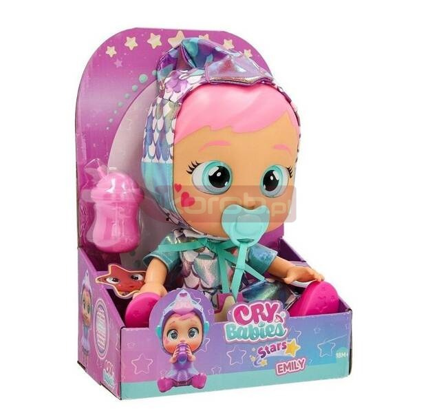 Cry babies sięgają teraz gwiazd z zupełnie nową cry babies star emily. Jeśli wyjmiesz jej smoczek z ust, będzie płakać prawdziwymi łzami, ale coney idzie o krok dalej. Zobacz, jak jej oczy rozświetlają gwiazdy tak jasne jak nocne niebo. Wydaje ponad 10 realistycznych dźwięków dziecka, aby przekazać emocje, takie jak radość, smutek, zabawa i wiele innych! Włóż smoczek z powrotem do ust, aby powstrzymać ją od płaczu i sprawić, by znów była szczęśliwa. Coney zachęca dzieci do angażowania się w pomysłowe zabawy, takie jak karmienie jej butelką dla niemowląt, ubieranie jej w pasujące buty i opieka nad nią jak prawdziwym dzieckiem.