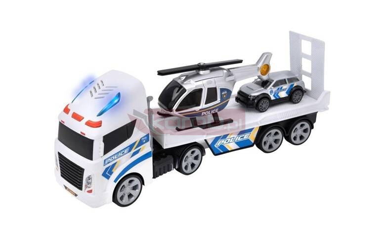 - w zestawie 3 pojazdy: laweta na baterie, helikopter, samochód policyjny;