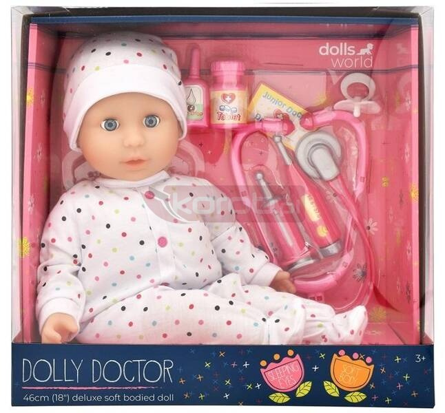 Lalka o wielkości 46cm z miękkim ciałem. Posiada śpiące oczka, przepiękne ubranko, smoczek oraz dodatkowe akcesoria związane z zabawą w lekarza.