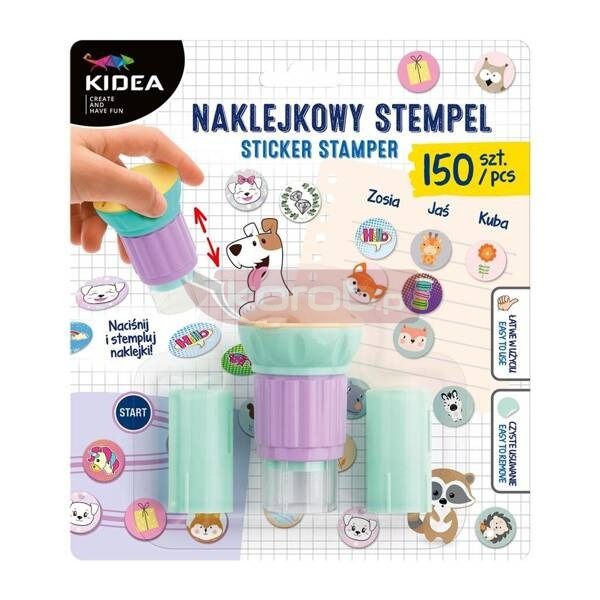Naklejkowy stempel. Można go wykorzystać na wiele sposobów: jako znacznik na tablicach motywacyjnych, do zdobienia prac plastycznych, prezentów albo listów, czy znacznika ważnych miejsc w książkach i kalendarzach. Naklejki umieszczone są wewnątrz stempelka dzięki wbudowanemu schowku z wkładem. Wystarczy przycisnąć produkt do powierzchni aby móc od razu stemplować naklejki. Do zestawu dołączone są dwa wkłady na wymianę.