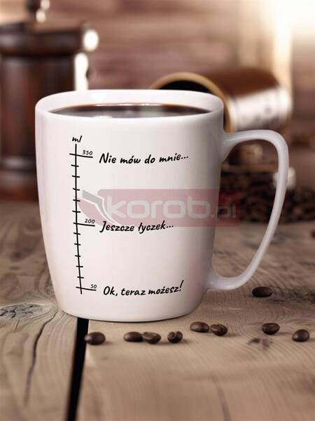 Nie mów do mnie teraz... chyba że masz drugą kawę! Przedstawiamy wyjątkowy kubek stworzony dla prawdziwego kawosza. Obserwuj, jak wraz z każdym łykiem Twoja chęć na rozmowę stopniowo rośnie. Gdy kubek jest pełen, potrzebujesz chwili wytchnienia, a gdy na dnie zostaje już tylko kilka kropel aromatycznego napoju, jesteś gotowy na podbicie świata. Ten kubek to historia o poranku każdego z nas. Wyobraź sobie tę scenę: budzisz się, słońce leniwie przebija się przez zasłony, a Ty sięgasz po swoją ulubioną filiżankę. Pierwszy łyk... i świat zwalnia. To właśnie ten moment, kiedy potrzebujesz chwili tylko dla siebie, kiedy nawet najlepszy przyjaciel/mąż/dziecko może poczekać. Podaruj ten kubek sobie lub komuś bliskiemu, kto tak jak Ty docenia magię porannej kawy. Idealny prezent dla miłośnika kawy istnieje! Kubek z porcelany Pojemność: 380 ml Pojemność użytkowa: 360 ml Zapakowany w szykowny kartonik Idealny prezent dla kawosza Nadruk po dwóch stronach kubka, logo na spodzie Można myć w zmywarce