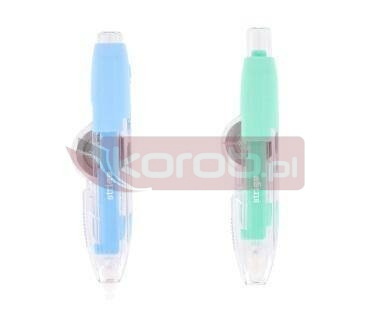 Korektor w taśmie z automatycznym mechanizmem zabezpieczającym przed zabrudzeniem i uszkodzeniami. Ergonomiczny kształt zwiększa komfort użytkowania. Wyjątkowo odporna taśma nie rozrywa się ani nie pęka. Korektor szybko schnie, dzięki czemu poprawek można dokonywać natychmiast po jego użyciu. Możliwość stosowania na wszystkich rodzajach papieru. Szerokość taśmy: 5mm, długość taśmy: 8m. Dostępny w 2 kolorach obudowy: zielony, niebieski.