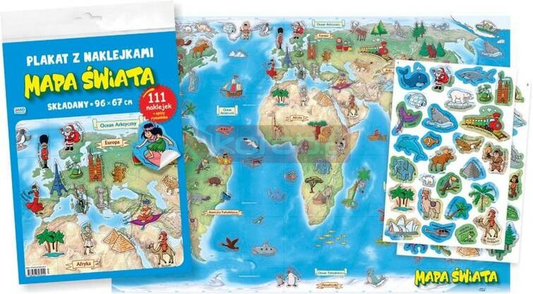 Świat jest piękny i bardzo różnorodny. Na każdym kontynencie i we wszystkich morzach i oceanach można znaleźć coś niesamowitego. Krzyczący strażnik królewski, pociąg jadący do celu niemal tydzień, plujące lamy czy widoczna z kosmosu rafa koralowa - czy nie jest to fascynujące? Dzieci są ciekawe tego, co dzieje się wokół nich, a podróże są świetną okazją, by pokazywać im świat i uczyć otwartości, tolerancji i wrażliwości. Drogi Rodzicu, nie zawsze masz możliwość w danym momencie spakować walizkę i wyruszyć wraz z dzieckiem w podróż, ale możesz poświęcić swój czas, by zacząć pokazywać mu odległe zakątki świata, chociażby w albumach, na zdjęciach i w filmach. Przygotowana przez nas mapa będzie doskonałym wsparciem i przewodnikiem. Zamieściliśmy na niej najbardziej charakterystyczne dla danego miejsca zwierzęta, budowle czy postacie. Niech staną się dla Ciebie inspiracją. Drogie Dzieci, specjalnie dla Was przygotowaliśmy zestaw naklejek, które umieszczone we właściwym miejscu pomogą zapamiętać to, co niezwykłego występuje na konkretnym kontynencie lub w wodach go otaczających. Bawcie się w rodzinne podróżowanie palcem po mapie, zachęcajcie siebie nawzajem do poznawania tego, co nieznane i do wspólnego spędzania czasu. A może będzie to początek wielkiej podróżniczej przygody w rzeczywistości? Publikacja składa się z trzech części: kolorowej mapy o wymiarach 96 x 67 centymetrów, 111 naklejek oraz tyluż opisów do przedstawionych na nich rysunków. Krótkie teksty zawierają wyjaśnienia pojęć, ciekawostki oraz lokalizacje.