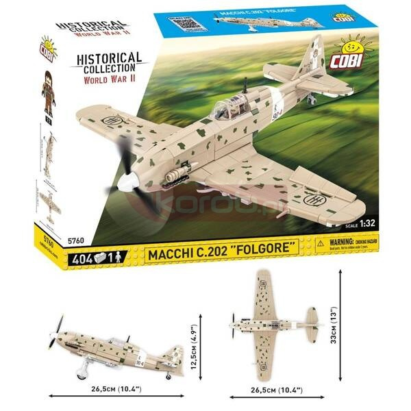 Macchi C.202 "Folgore" COBI-5760 Historical Collection WORLD WAR II 404 klocki 1 figurka Grupa Wiekowa 7+ Skala 1:32 Macchi C.202 "Folgore" był jednym z najważniejszych i najbardziej udanych myśliwców włoskich podczas II wojny światowej. Jego zaawansowana konstrukcja i dobre osiągi czyniły go groźnym przeciwnikiem w walce powietrznej. Mimo ograniczeń w uzbrojeniu i produkcji MC.202 zapisał się w historii jako symbol włoskiej inżynierii lotniczej z okresu wojny. Teraz ta legenda włoskiego nieba jest dostępna w wersji klockowej. Wykonany z 404 elementów samolot wprowadza do oferty COBI powiew śródziemnomorskiej świeżości. Model posiada kamuflaż z teatru działań w basenie Morza Śródziemnego. Za pomocą trwałych i nieścieralnych nadruków na piaskową bazę nałożono zielone plamki, rozmywające sylwetkę maszyny w powietrzu. Myśliwiec posiada składane podwozie, ruchome klapy, a pod zdejmowanym dachem kokpitu można umieścić doskonale odwzorowaną figurkę włoskiego pilota. Samolot standardowo posiada podstawkę ekspozycyjną wraz z nazwą i przezroczystym trzpieniem, dzięki któremu samolot wygląda, jakby leciał. Macchi MC.202 był rozwinięciem wcześniejszego modelu MC.200 Saetta, który miał gorsze osiągi. Projektant Mario Castoldi zastosował silnik Daimler-Benz DB 601Aa, który znacząco poprawił osiągi samolotu w porównaniu do jego poprzednika. Prototyp MC.202 oblatano 10 sierpnia 1940 roku. Produkcja seryjna rozpoczęła się w 1941 roku, a pierwsze samoloty trafiły do jednostek liniowych jeszcze w tym samym roku. MC.202 został szeroko używany w kampanii afrykańskiej, gdzie stanowił poważne zagrożenie dla alianckich myśliwców. Jego prędkość i manewrowość były na poziomie Spitfire'ów i P-40 Warhawków, które napotykał w walce. Po upadku Afryki Północnej MC.202 był używany do obrony terytorium Włoch przed nalotami alianckimi oraz w walkach nad Sycylią. MC.202 służył również na Bałkanach i w obronie Rodos. Samolot był bardzo zwrotny, co czyniło go groźnym przeciwnikiem w walce powietrznej, a jego wytrzymała i solidna konstrukcja kadłuba pozwalała na przetrwanie w trudnych warunkach bojowych. Samolot nie był wolny od wad. Stosunkowo lekkie uzbrojenie w porównaniu do myśliwców alianckich, w postaci karabinów maszynowych kalibru 12,7 mm było mniej skuteczne niż działka, które montowano w wielu alianckich i niemieckich myśliwcach. 404 wysokiej jakości elementy, Wyprodukowane w UE przez firmę z ponad 35-letnią tradycją, Spełniają normy bezpieczeństwa dotyczące produktów dla dzieci, W pełni kompatybilne z innymi markami klocków konstrukcyjnych, Zastosowano tylko trwałe nadruki bez użycia naklejek, Czytelna i intuicyjna instrukcja oparta na rysunkach i ikonach, 1 figurka, Podstawka ekspozycyjna zawierajaca tabliczkę z nazwą, Skala 1:32, Wymiary modelu (dł x szer x wys): 26,5cm (10.4") x 33cm (13") x 12.5cm (4.9")