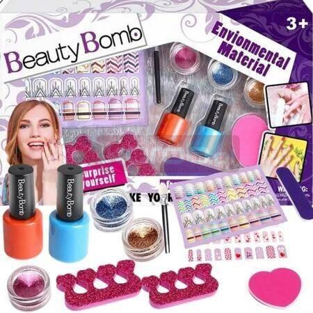 W zestawie znajdują się aż 2 lakiery w różnych, modnych kolorach a także błyszczące ozdoby, które sprawią, że paznokcie dziewczynki będą się wspaniale prezentować!