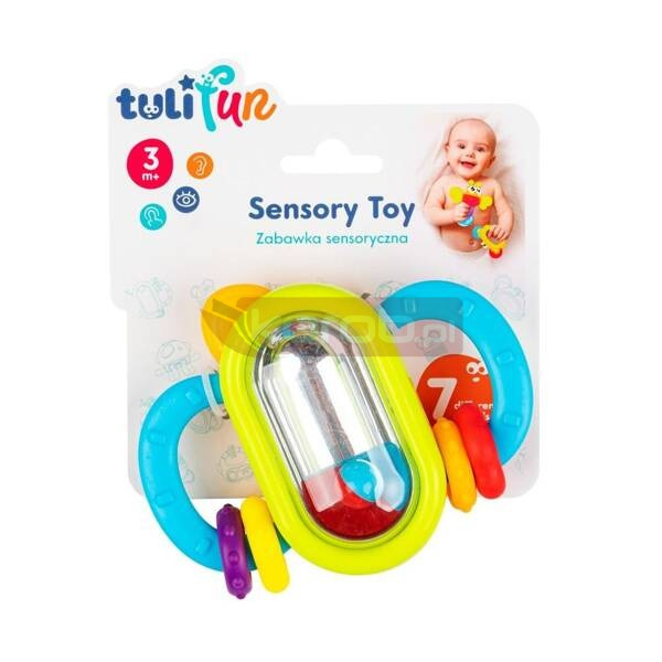 Kompaktowa zabawka, która łączy w sobie gryzak i grzechotkę. Wyposażona jest w dwa miękkie uchwyty z wypustkami, które przyniosą ulgę obolałym dziąsłom ząbkującego malucha. Na uchwytach znajdują się kolorowe kółeczka, które można przesuwać. W środkowej części znajduje się grzechocząca, dwustronna kuleczka, dzięki czemu zabawka wydaje wesoły dźwięk przy potrząsaniu. Niewielki rozmiar grzechotki pozwala korzystać z niej zarówno w domu, jak i w podróży.
