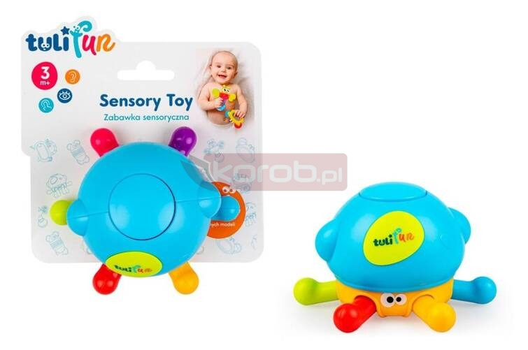 Kompaktowa ośmiornica wydaje wesołe dźwięki, które zabawią malucha. Na czubku jej głowy znajduje się ukryta piszczałka. Ramiona ośmiornicy można odginać, której to czynności towarzyszy zabawne terkotanie. Terkocze też sama głowa ośmiornicy , podczas przekręcania jej dookoła własnej osi. Kształt zabawki dostosowany jest do małych rączek, co czyni ośmiorniczkę wymarzonym towarzyszem pierwszych, sensorycznych zabaw, zarówno w domu, jak i w podróży.