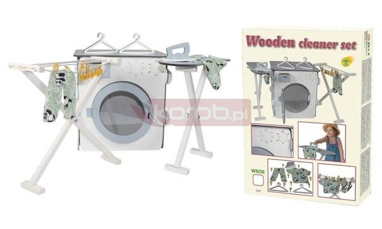 DUŻY, Drewniany, kolorowy zestaw pralka, suszarka, deska do prasowania! Zestaw zawiera: pralkę, suszarkę, deskę do prasowania, dwa wieszaki, koszulę i spodnie, 10 klamerek-emotikonek oraz żelazko. Całość znajduje się w kolorowym opakowaniu.