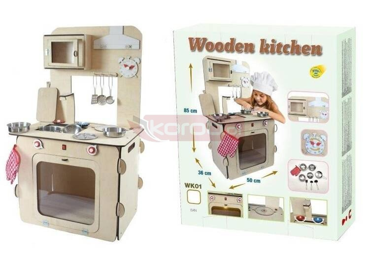 DUŻA, drewniana, naturalna kuchnia! Kuchnia zawiera zestaw garnków i narzędzi ze stali nierdzewnej, zegar z ruchomymi wskazówkami, mikrofalę, okap, imitacja palnika z włącznikiem światełka, piekarnik ze światełkiem, kran z zębatkami ruchomymi imitującymi kurki oraz materiałową rękawicę kuchenną. Całość znajduje się w kolorowym opakowaniu.