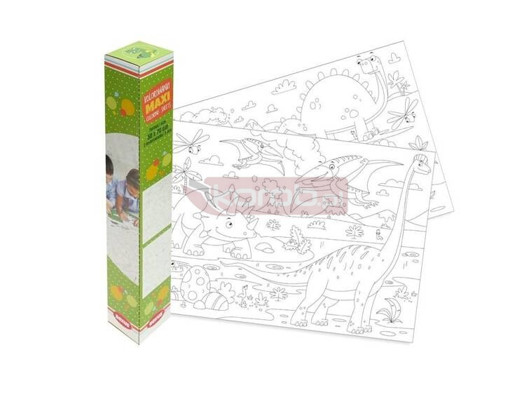 Wielkoformatowa kolorowanka wykonana z grubego, białego papieru. Możliwość pracy kilku osób jednocześnie. Profesjonalna grafika, wyraźny druk w kolorze czarnym. Rolowany bez zagnieceń. W tekturowej tubie chroniącej przed zniszczeniem. Odpowiedni do kolorowania kredkami, flamastrami, markerami i farbami. Na kolorowance znajduję się motyw idealny dla chłopców - Dinozaury.