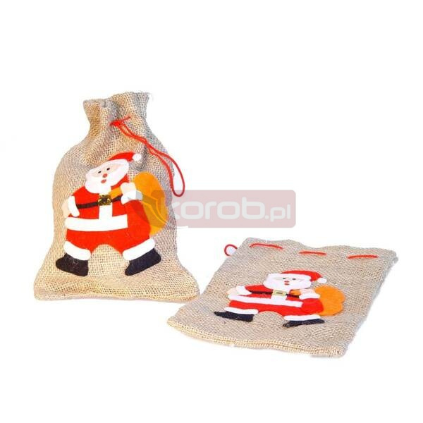 Worek na prezenty wykonany z naturalnego materiału jutowego. Na przodzie produktu znajduje się aplikacja dekoracyjna z filcu. Produkt wyposażony w sznurek ściągający umożliwiający zawiązanie worka. Worek może służyć jako element dekoracyjny lub jako wyjątkowe opakowanie prezentu. Wymiary worka to 26x20 cm.