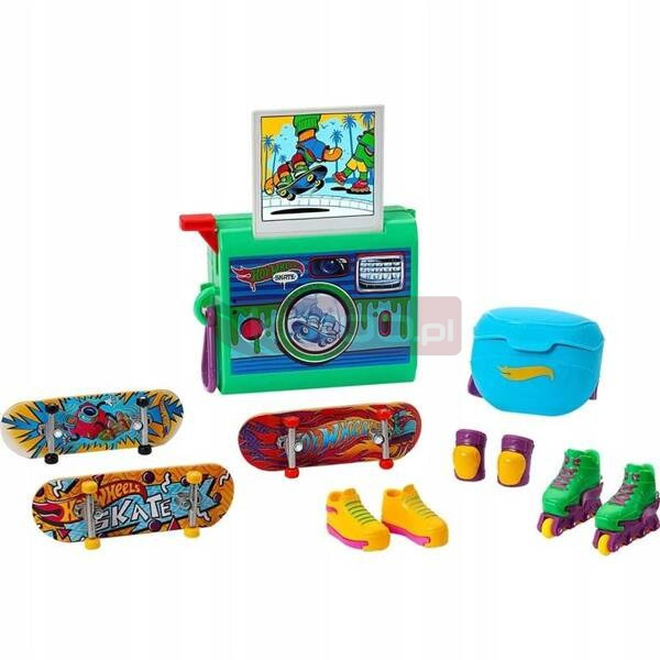 Przejdź na zupełnie retro dzięki pakietowi Rewind & Grind Hot Wheels Skate 90's! Zawiera trzy podstrunnice ze słodką, oldschoolową grafiką i parę wymiennych butów do skateboardingu, których można używać zamiennie z dowolną deską. Naciśnij przycisk na aparacie, aby przekształcić obraz w rampę i rozpocząć niszczenie! Chcesz zmienić metodę jazdy na rolkach Wypróbuj rolki typu Finger in-line z parą nakolanników na kostkach. Zapakuj łyżwy i nakolanniki do nadającego się do noszenia na nadgarstku plecaka typu „fanny”, a deski i buty przechowuj w aparacie, aby ułatwić przenoszenie i przechowywanie!