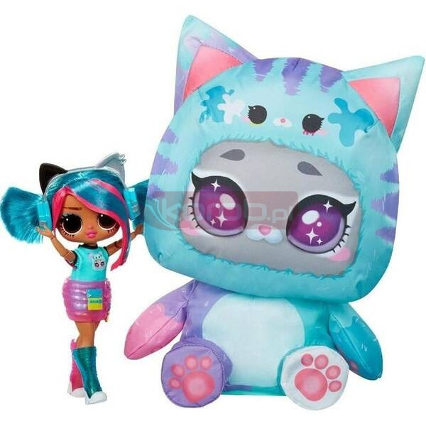 Najpierw rozerwij zamek błyskawiczny na dole opakowania i podnieś zewnętrzną różową osłonę, aby odsłonić tajemniczy papier do pakowania! Obserwuj, jak papier staje się większy i pełniejszy, a po całkowitym napompowaniu rozerwij papier i odkryj swój uroczy kostium turkusowego kotka! Ale czekaj, to nie koniec niespodzianek! Odepnij rzep z tyłu głowy kotka, aby odsłonić ukrytą w środku wspaniałą lalkę Emo Emma Tweens!