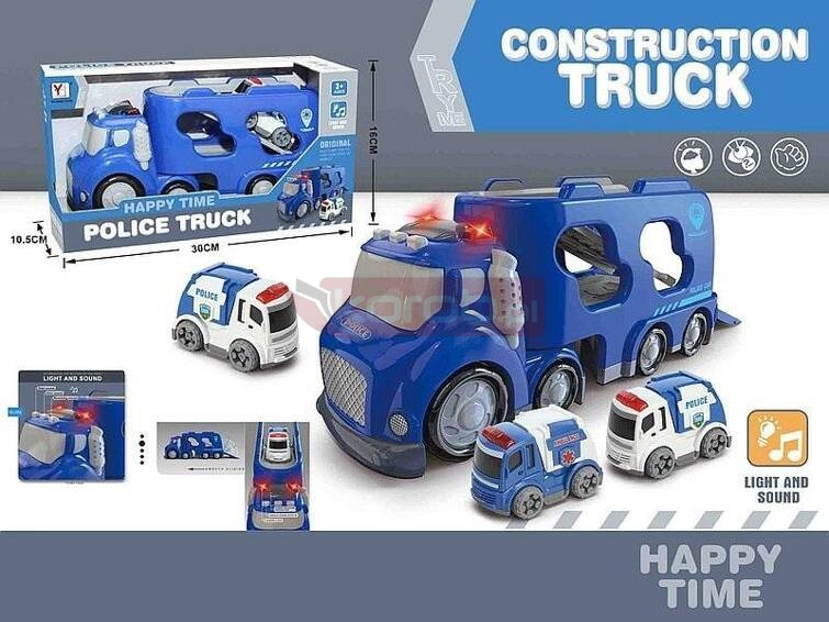 auto z kontenerem i autem policyjnym, światło, dźwięk; 30x10,5x16cm, W/B