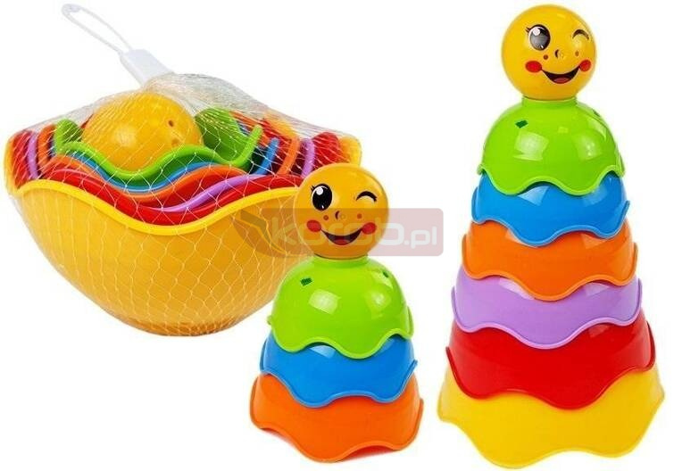 Kolorowa piramidka z kubeczków Piramidka w kolorach tęczy jest zabawką, która doskonale wpływa na rozwój maluszka. Składa się z kubeczków w różnych kolorach. Na szczycie zabawki znajduje najmniejszy kubeczek z nadrukiem wesołej buźki. Kubeczki wykonane są z bezpiecznego, nietoksycznego materiału, który odznacza się solidnością i wytrzymałością. Piramidka ma bardzo opływowy, zaokrąglony kształt, co wpływa na poziom bezpieczeństwa płynący z korzystania z przedmiotu. Każdy z kubeczków posiada inny kolor. Zabawka ta charakteryzuje się nie tylko pięknym, nowoczesnym designem, ale również szeregiem istotnym w rozwoju dziecka zalet: rozwija motorykę i sprawność ruchową malucha, pozwala ćwiczyć paluszki i chwytanie. Zabawa z piramidką poprawia zdolności manualne dziecka, a także rozpoznawanie kolorów i kształtów. Sortowanie kubeczków pozwoli na zrozumienie zależności, jakie zachodzą pomiędzy przedmiotami o różnych wymiarach. Zabawka ćwicząca kreatywność i umiejętność logicznego myślenia nie ma zasad, według której należy się nią bawić - to, w jaki sposób można z niej korzystać, zależy tylko od dziecka, jego rodziców i ich wyobraźni. Jesteśmy pewni, że bogata, bajeczna kolorystyka, a także wysoka jakość wykonania zabawki zachęcą każdego maluszka do nauki poprzez zabawę. Tęczowa piramidka posiada certyfikat CE. Wymiary opakowania: 12 cm x 12 cm x 7 cm