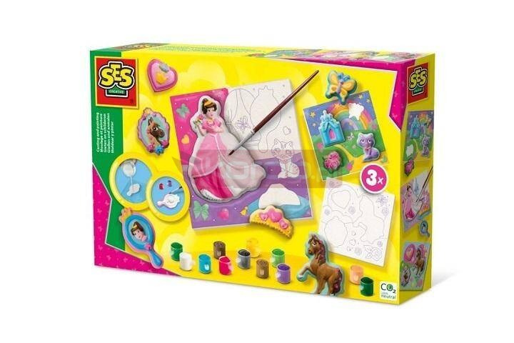 Twórz trójwymiarowe obrazy księżniczek! Dzięki temu pięknemu, obszernemu zestawowi do odlewów gipsowych można odlewać figurki księżniczek i malować je na pięknych, wytrzymałych płótnach. Wystarczy wlać gips w dołączone formy i przykleić je w odpowiednich miejscach na płótnie. Zarysowane motywy ułatwiają malowanie. Zarówno farba, jak i tynk są łatwo zmywalne z tkanin i skóry.