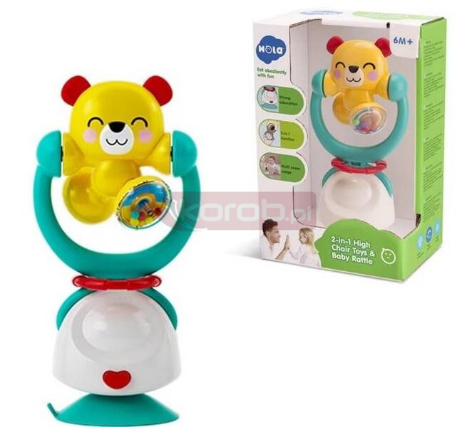 Zabawka z grzechotkami w kształcie misia, którą można zamontować na stoliku dziecka, na jego krześle, na parkiecie i innych płaskich powierzchniach.