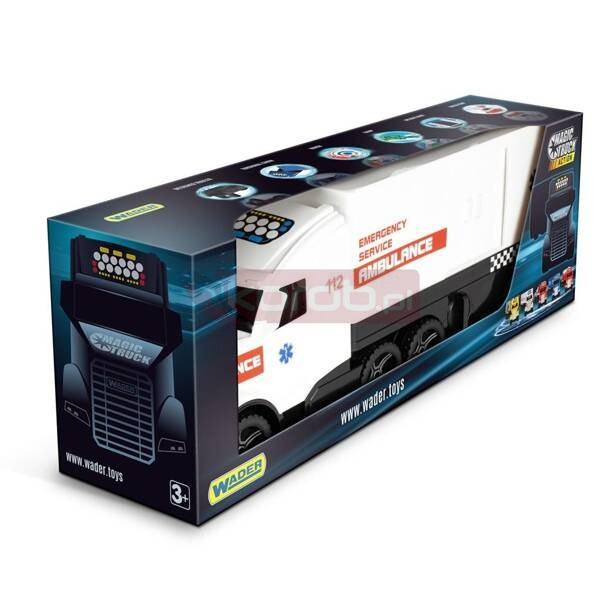 Magic Truck Action to niepowtarzalna seria dużych pojazdów, o których marzy każde dziecko. Stworzone z pasją, są odzwierciedleniem prawdziwych ciężarówek dzięki czemu można się nimi bawić na wiele sposobów. Magic Truck Action - Ambulans w kolorze białym z czerwonymi akcentami posiada skrętną skrzynię ładunkową, którą można przyczepić do pojazdu na 2 sposoby. Kontener posiada rozsuwane drzwi boczne oraz otwieraną tylną klapę, dzięki którym można do niego ładować różne przedmioty. Naczepa posiada wysuwane nóżki podporowe, które pozwalają stworzyć z niej samodzielną przyczepę. Pojazd wykonany jest z materiałów bezpiecznych dla dzieci. Ogromną zaletą jest trwałość i wytrzymałość konstrukcji, co sprawia, że zabawka może służyć dzieciom latami. Opis techniczny masywna konstrukcja i ogromna wytrzymałość posiada odczepiany, skrętny kontener z rozsuwanymi drzwiami bocznymi i z otwieraną tylną klapą oraz nóżkami podporowymi 2 możliwości przyczepienia naczepy - maksymalna długość pojazdu to 81 cm wykonany jest z materiałów bezpiecznych dla dzieci odpowiedni dla dzieci 3+