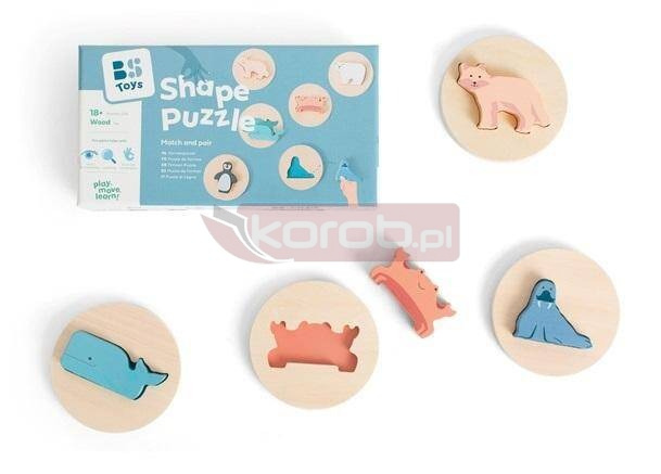 Dziecko ma za zadanie dopasować w okrągłe drewniane podstawki różne zwierzątka: fokę, białego niedźwiedzia, kraba, pingwinka, liska i orkę. Duże elementy są dopasowe do wielkości małych dłoni i doskanale mogą służyć do zabawy, spakowania do plecaka i zabrania w podróż.