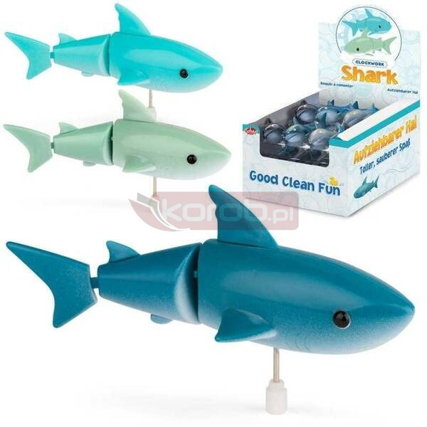 Nakręcana zabawka do kąpieli w kształcie rekina z ruchomą tylną płetwą. Po nakręceniu rekin pływa w wodzie, poruszając tylną płetwą z boku na bok, aby poruszać się w wodzie. Dostępny w trzech kolorach.