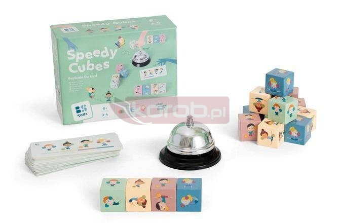 W zestawie znajduję się : 16 kostek (3 x 3 cm), 1 dzwonek (8,5 cm), 30 kart (5 x 12 cm).