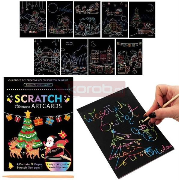 Zdrapywanki w formie 9 czarnych kart pokrytych zdrapywalną farbą.Weź do ręki drewniany patyczek i stwórz swój niepowtarzalny obrazek świąteczny.