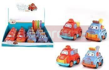 Opis: 12 szt/disp, dł. auta 9 cm, 2 wzory do wyboru: dźwig, wóz strażacki, napęd frykcyjny, wym. disp. 30,5 x 29 x 8 cm, 3+