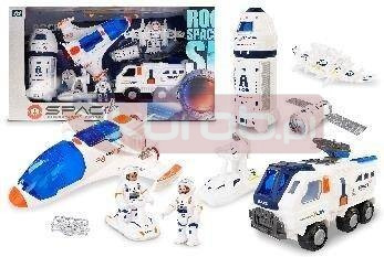 W zestawie: 3 figurki astronautów wys. 8 cm, 6-kołowa ciężarówka dł. 24 cm, rakieta wys. 24,5 cm, statek kosmiczny dł. 24 cm, kosmiczna lotnia wym. 12 x 19 cm, sonda kosmiczna dł. 9 cm, 2 mini pojazdy naziemne, funkcje: statek kosmiczny - 2 otwierane kabiny pilotów, ciężarówka - otwierana kabina kierowcy, ruchome elementy, rakieta - rozłącza się na 2 części: kapsułę powrotną i rakietę, otwierane 2 kabiny, figurki - ruchome elementy, wym. opak. 59,5 x 34 x 11 cm, 3+