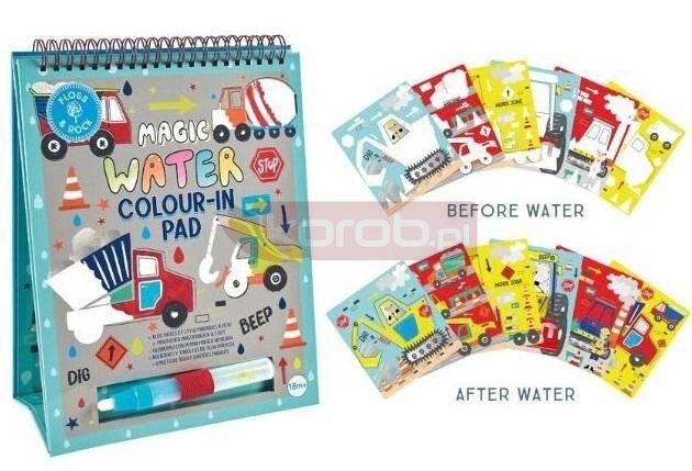 Kolorowanka wodna z pisakiem i podpórką to świetna zabawa dla najmłodszych. Wystarczy napełnić pisak wodą i zachęcić dziecko do kreatywnej zabawy, aby zobaczyć, jak kolory i kształty magicznie się pojawiają, a po wyschnięciu znikają. Dziecko będzie się świetnie bawić, odkrywając kolorowe koparki, ciężarówki, dźwigi, koparki, małych budowniczych i nie tylko. Sześć zabawnych kart jest połączonych w spiralnie oprawionej okładce, dzięki czemu można je odwracać po ukończeniu. Podpórka wygodnie podtrzymuje karty wielokrotnego użytku. Po zakończeniu zabawy wystarczy złożyć podpórkę, a dzięki elastycznej gumce pisak zawsze będzie na swoim miejscu.