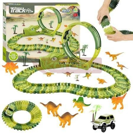 Ten niezwykły zestaw toru wyścigowego z dinozaurami to doskonała zabawka dla każdego małego miłośnika tych prehistorycznych stworzeń.