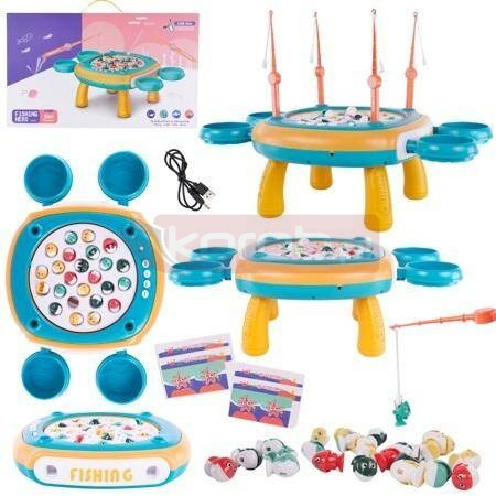 Interaktywny stolik z rybkami: Stolik został zaprojektowany tak, aby oferować dynamiczną i ekscytującą rozgrywkę. Podstawa stolika jest wyposażona w magnetyczne rybki, które obracają się, oraz emituje dźwięki muzyczne, co dodaje atmosfery i emocji do zabawy.