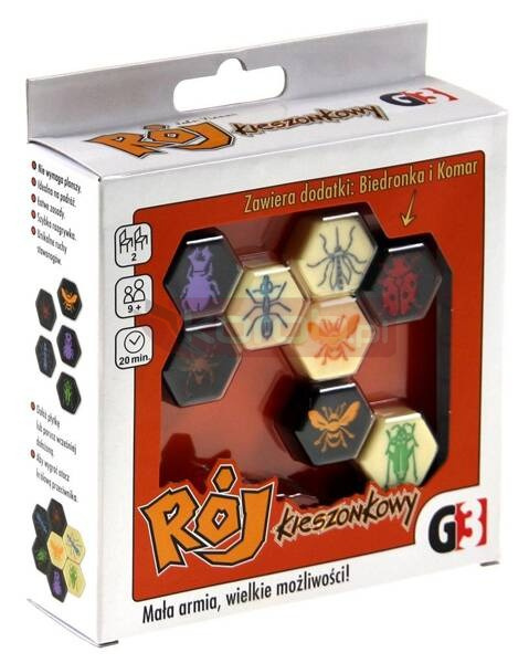 Rój kieszonkowy to jak sama nazwa wskazuje, mniejsza wersja popularnej, znanej na całym świecie gry logicznej. To równie wspaniała gra, jak standardowa wersja. Ta sama, bardzo wysoka jakość, ale kompaktowy rozmiar. Jedziesz na kolonię lub wycieczkę? Nie masz za dużo wolnego miejsca w plecaku? Rój kieszonkowy to idealne rozwiązanie! Teraz możesz zabrać swoją ulubioną grę, gdzie tylko chcesz! Rój jest grą dla dwóch graczy. Każdy gracz ma trzynaście płytek, przedstawiających siedem różnych owadów: pszczoła (królowa), żuk, konik polny, pająk, mrówka, biedronka i komar. Ciekawostka: biedronka i komar są dodatkami, które zostały dołączone na stałe do wersji kieszonkowej. Celem gry jest otoczenie królowej przeciwnika. Gracze wykonują swoje ruchy na zmianę. W swoim ruchu mogą albo dołożyć owada do roju, albo przesunąć jedną z wcześniej zagranych płytek. Każda płytka posiada unikalny sposób poruszenia (jak w szachach), naśladujący ruch przedstawionego na niej owada. Na przykład, konik polny jest jedynym owadem potrafiącym przeskakiwać inne płytki. ZAWARTOŚĆ: 26 płytek 1 woreczek instrukcja