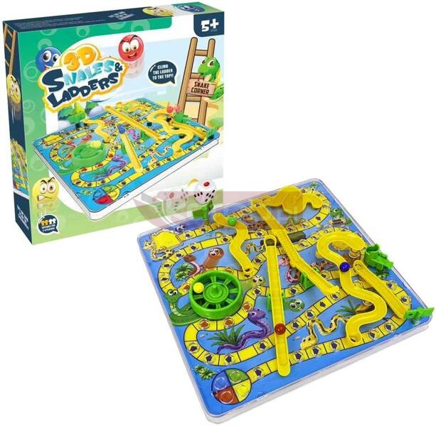 Wężę i drabiny 3D to popularna i wspaniała gra dla najmłodszych. W zestawie gry znajduje się plansza, po której poruszamy się specjalną kulką. Każdy z graczy ma inny kolor kulki. Po rzucie kostką porusza się tyle ile wyrzucił oczek. Kiedy nasza kulka wejdzie na specjalne miejsce może poruszyć się do przodu dzięki drabinie lub w dół, jeśli wejdziemy na węża. Plansza jest w wymiarze 3D, więc gdy wjedziemy na specjalne miejsce nasza kulka przemieści się po naszej planszy. Gra jest idealna opcją na rodzinne wieczory. Gra rozwija umysł, koordynacje ruchowo-wzrokową i logiczne myślenie naszych pociech.