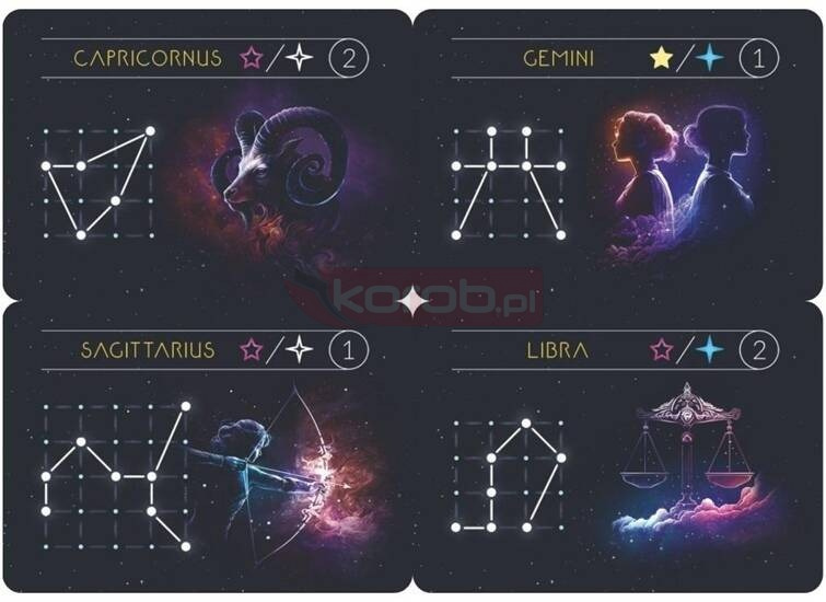 Zawartość: 12 kart z konstelacjami Zodiaku.