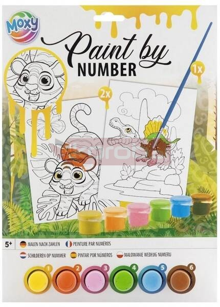 2 x arkusz do malowania w formacie A4 + 6 farb + pędzelek. Wymiary: 21 x 29.7 cm
