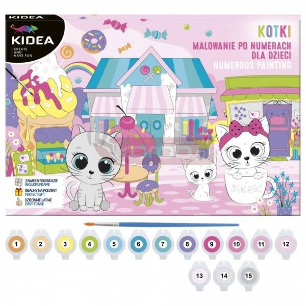 Obraz do malowania po numerach z kotkami od KIDEA to idealna kolorowanka dla małych artystów. Malując obraz zgodnie z oznaczeniem numerycznym, odkryjesz przeuroczy świat pełen słodkich przekąsek i kotków. Gotowe dzieło będzie piękną dekoracją pokoju dziecka. Obraz sprawdzi się idealnie u dzieci, które rozpoczynają swoją przygodę z malowaniem. Co więcej, dzięki kolorowance numerycznej Twoje dziecko będzie ćwiczyć swoje zdolności motoryczne, nauczy się skupiać uwagę oraz będzie stymulowało swoją wyobraźnię i kreatywność.