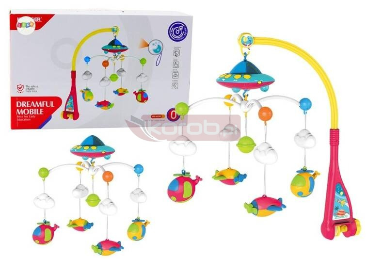 Karuzelka Do Łóżeczka Dla Niemowlaka Ufo Samoloty Projektor 108 Melodii Wyjątkowa karuzelka do łóżeczka z projektorem to doskonałe rozwiązanie dla rodziców, którzy pragną stworzyć uspokajającą i rozwijającą atmosferę dla swojego dziecka. Wyposażona w unikalny projektor, karuzelka umożliwia tworzenie magicznego spektaklu świetlnego, który w delikatny sposób zmieniają się, przyciągając uwagę maluszka i pomagając mu wyciszyć się przed snem. Karuzelka ma formę uroczej pozytywki w kształcie UFO, co nadaje jej nowoczesny i atrakcyjny wygląd, doskonale pasujący do pokoju dziecięcego. Na ramionach karuzelki zawieszone są zabawki w kształcie samolotów i helikopterów, które delikatnie kręcą się w takt muzyki, stymulując zmysły dziecka i zachęcając do obserwacji. Dzięki temu maluszek rozwija zdolności motoryczne i percepcyjne, podążając wzrokiem za poruszającymi się elementami. Karuzelka oferuje aż 108 różnych melodyjek do wyboru, co pozwala na dostosowanie odtwarzanej muzyki do nastroju i potrzeb dziecka. Od kojących kołysanek po delikatne dźwięki natury - karuzelka zapewnia szeroką gamę utworów, które pomogą uspokoić i zrelaksować maluszka. Regulacja głośności możliwa jest za pomocą przycisków na karuzelce, co daje pełną kontrolę nad poziomem dźwięku. Całość jest solidnie wykonana z bezpiecznych, atestowanych materiałów, co gwarantuje trwałość i bezpieczeństwo użytkowania. Karuzelka z projektorem to idealny wybór dla każdego rodzica, który chce zapewnić swojemu dziecku spokojne noce i radosne chwile w ciągu dnia. Karuzelka zasilana jest na baterie 3x 1.5V AAA i 2x 1.5V AA, które nie są elementem zestawu. Wymiary karuzelki: 50cm x 48cm Wymiary opakowania: 41cm x 26cm x 11cm Posiada certyfikat CE, ponadto jest zgodny z normą EN71. Przeznaczony dla dzieci od pierwszych miesięcy życia.