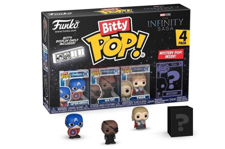 - tajemnicza figurka Bitty Pop! (możliwe tajemnicze figurki Bitty Pops to: rzadki (1/3) Iron Man, rzadki (1/3) Kapitan Ameryka, hiperrzadki (1/6) Doctor Strange i hiperrzadka (1/6) Scarlet Witch),