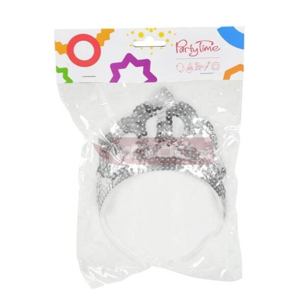Tiara księżniczki na opasce. Ozdobne akcesorium na głowę. Tiara pokryta jest błyszczącymi cekinami. Ładnie mieni się w świetle. Urokliwy dodatek do stroju księżniczki, wróżki lub samodzielny gadżet. Idealna na bale przebierańców, zabawy, przyjęcia urodzinowe lub tematyczne.
