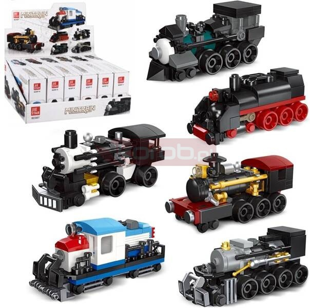 Zestaw klocków z których można zbudować lokomotywy zawierający 77 elementów.