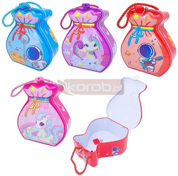 Metalowa, lakierowana skarbonka z motywem kosmosu lub jednorożca. Idealny pomysł na prezent, który uczy oszczędności i sprawia, że pieniądze są bezpieczne dzięki kłódce zamykanej na kluczyk.