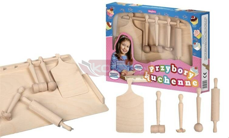 Zestaw dużych przyborów kuchennych dla najmłodszych dzieci będzie dla nich świetnym prezentem a akcesoria w nim zawarte przydadzą się każdej małej gosposi . Realistyczny wygląd i kształty przyborów gwarantują fantastyczną zabawę i są okazją do pierwszych małych eksperymentów w kuchni. Przybory są starannie wykończone i bezpieczne dla dziecięcych rączek. Jest to solidna i kreatywna zabawka. Zestaw zawiera stolnicę o wymiarach (39 x30 cm) oraz deseczkę do krojenia, rogalkę, tłuczek, wałek i młotek. Przybory wykonane są z wyselekcjonowanego naturalnego drewna bukowego które jest przyjazne dla środowiska.