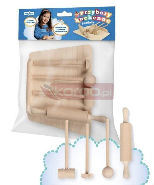 Zestaw średnich przyborów kuchennych dla najmłodszych dzieci będzie dla nich świetnym prezentem a akcesoria w nim zawarte przydadzą się każdej małej gosposi . Realistyczny wygląd i kształty przyborów gwarantują fantastyczną zabawę i są okazją do pierwszych małych eksperymentów w kuchni. Przybory są starannie wykończone i bezpieczne dla dziecięcych rączek. Jest to solidna i kreatywna zabawka . Zestaw zawiera stolnicę o wymiarach (22 x16,5 cm) oraz rogalkę, tłuczek, wałek i młotek. Przybory wykonane są z wyselekcjonowanego naturalnego drewna bukowego które jest przyjazne dla środowiska.