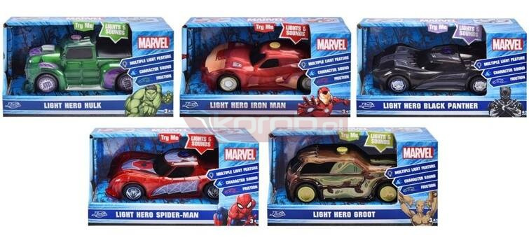 Pojazd na licencji Marvela z funkcją światła i dźwięku. Posiada napęd cierny. Skala 1:32