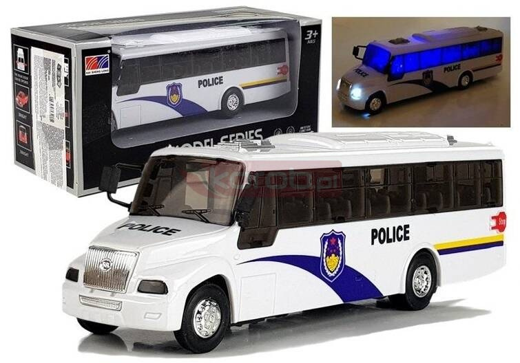 Model Autobusu Bus Policyjny Świeci Biały Cechami, na które często zwracana jest uwaga przy pierwszym kontakcie z zabawką są jej rozmiary i waga. W obu tych kategoriach Metalowy Autobus Szkolny sprawuje się świetnie. Pojazd jest długi na 21 centymetrów, a biorąc go do dłoni zdecydowanie czuć jego ciężar. Replika Autobusu szkolnego wykonana została z dbałością o wszelkiego rodzaju szczegóły. Czarne lusterka i uszczelki w oknach, srebrne kołpak i elementy na dachu, a także w pełni przezroczyste szyby podkreślają realistyczny charakter zabawki. Autobus jest również wyposażony w oświetlenie oraz w głośnik, który wydaje odgłosy działającego silnika. Samochód posiada także funkcję jazdy - wyposażony jest w silnik działający na zasadzie naciągu "Pull-Back". Do uruchomienia funkcji dźwiękowych oraz świetlnych niezbędne jest wyposażenie autobusu w 3 baterie AA - nie są one dołączone do zestawu. Zabawka nadaje się dla dzieci powyżej trzeciego roku życia. Wymiary opakowania: 21 cm x 10 cm x 9 cm.