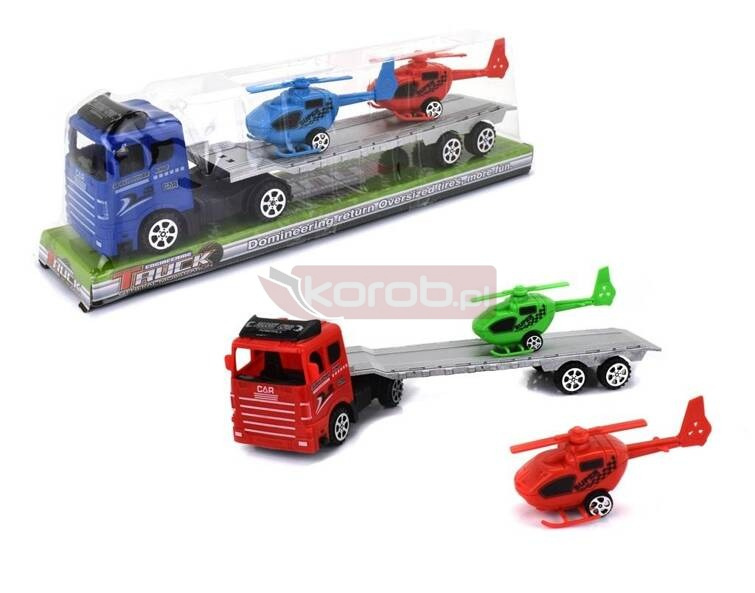 Ciężarówka została wyposażona w długą, otwieraną rampę, na której możecie przewozić helikopter, jak i inne pojazdy. Ciężarówka z lawetą to masa zabawy dla każdego dziecka. Lawetę można odczepić od ciężarówki. Opakowanie typu Window Box ułatwia zapoznanie się z funkcjami zabawki. Helokoptery posiadają 2 kółka, które ułatwią poruszanie się po powierzchni.
