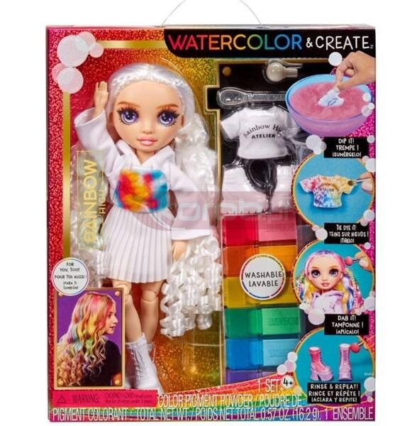 Nowa seria bestsellera! Rainbow High Watercolor & Create Fashion. Lalki inspirują kreatywność. Dzięki nowej serii można zaprojektować swoje własne lalki metodą Tie-Dye! Możesz zaprojektować im ubrania oraz zmienić kolor włosów. Zmywalne farbki można używać nawet na własnych włosach! Następnie po prostu spłucz i powtórz i zrób to od nowa. W serii znajdują się trzy nowe lalki, wszystkie w białym kolorze dla najlepszego efektu farbowania.
