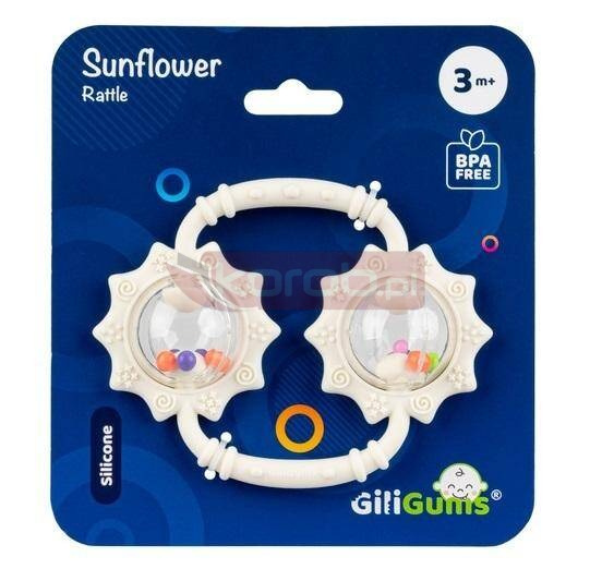 Urocza zabaweczka ze zdwojonym walorem 2w1! Po pierwsze, posiada aż dwie kule wypełnione koralikami, po drugie, łączy w sobie funkcję grzechotki oraz gryzaka. Kolorowe koraliki, wydają wesoły dźwięk przy każdym potrząsaniu zabawką. Otaczają je miękkie obręcze w kształcie słoneczników, ozdobione wypustkami o zróżnicowanym kształcie. Dzięki temu, przy gryzieniu kwiatkowych płatków, wypustki będą masować obolałe dziąsła malucha, przynosząc mu ulgę. Wygodne uchwyty, łączące kwiatki, ułatwią małym rączkom trzymanie zabawki.