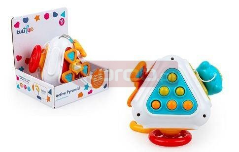Kompaktowa zabawka towarzyszyć może maluchowi w każdej sytuacji, zarówno w domowym zaciszu, jak i podczas wycieczki. Piramidka kryje w sobie wiele praktycznych zadań, które pozwolą najmłodszym ćwiczyć sprawność paluszków. Znajdziemy tu wtyczkę z piszczałką, którą należy dopasować do otworów w ściance, wiatraczek do obracania paluszkiem, kuleczki do wciskania, a także kierownicę do obracania.